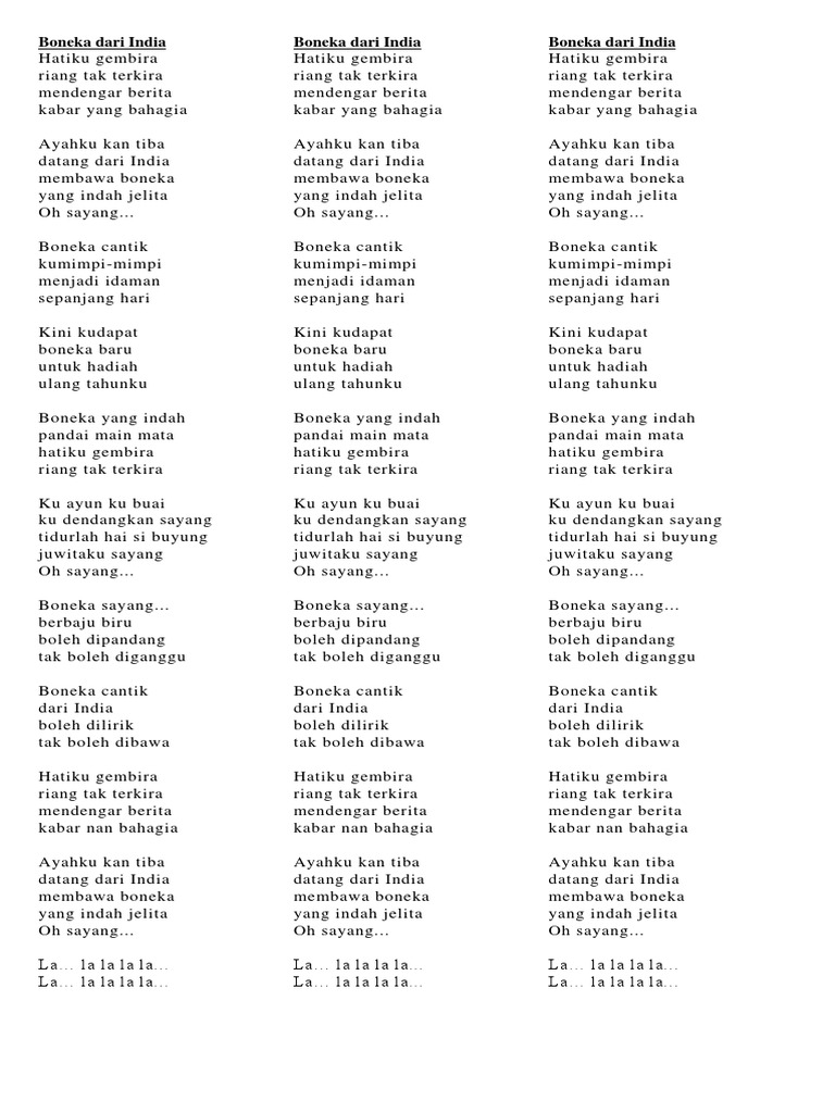 . Selamat BernyanyiHatiku gembirariang tak terkiramendengar beritakabar nan bahagiaAyahku kan tibadatang dari Indiamembawa boneka yang indah jelitaOh sayang. Boneka cantik dari India. Lirik Lagu Boneka India -.